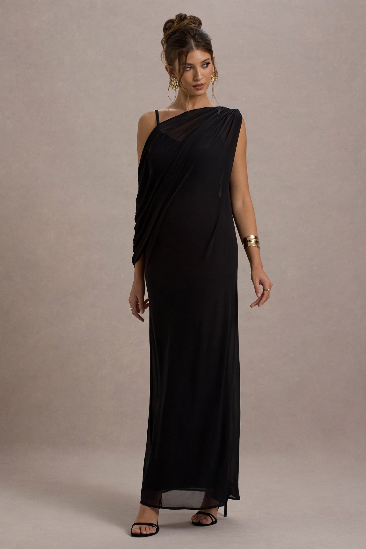 Exude an ethereal state of mind in Aeliana, our captivating maxi dress. Designed in a classic black shade of our premium woven fabric, this floor-sweeper is defined by an asymmetric neckline, adjustable cami straps and dreamy chiffon overlay.