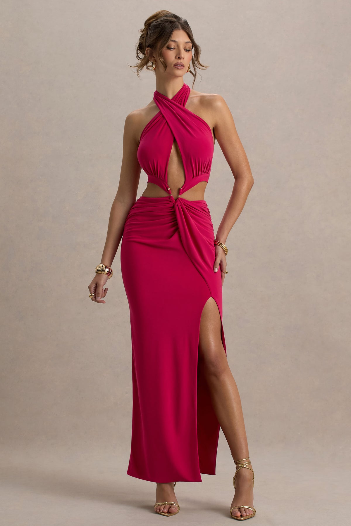 Step into the room and let your Aura do the talking. Designed to command attention, this show-stopping maxi is cut from our signature premium stretch jersey, in a rich hot pink hue. This dress will sculpt your curves with effortless elegance. The halter neckline features a functional tie for a customizable fit, while the daring body cut-outs and a a luxe metal detail at the waist create a cinched hourglass silhouette. Style with sleek heels and let your presence speak for itself.