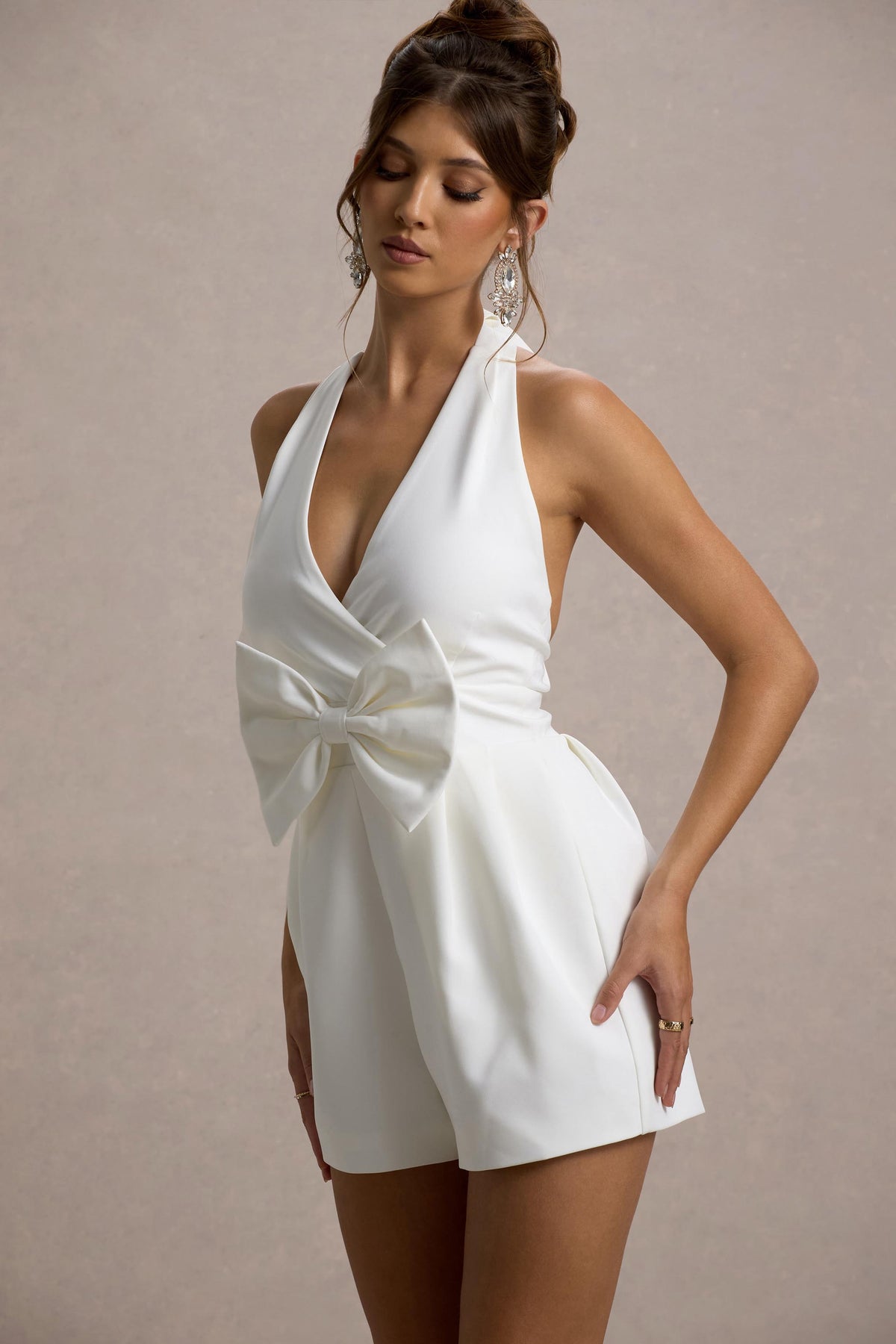 Dress to impress this party season with our charming playsuit, Darla. Conjured up in a classic stretch crepe, this white piece boasts a flattering plunge neckline, self-tie halter and eye-catching bow that sits front and centre. For a playful party ensemble, pair yours with a tousled bun and some silver stilettos like Crossed Wires.