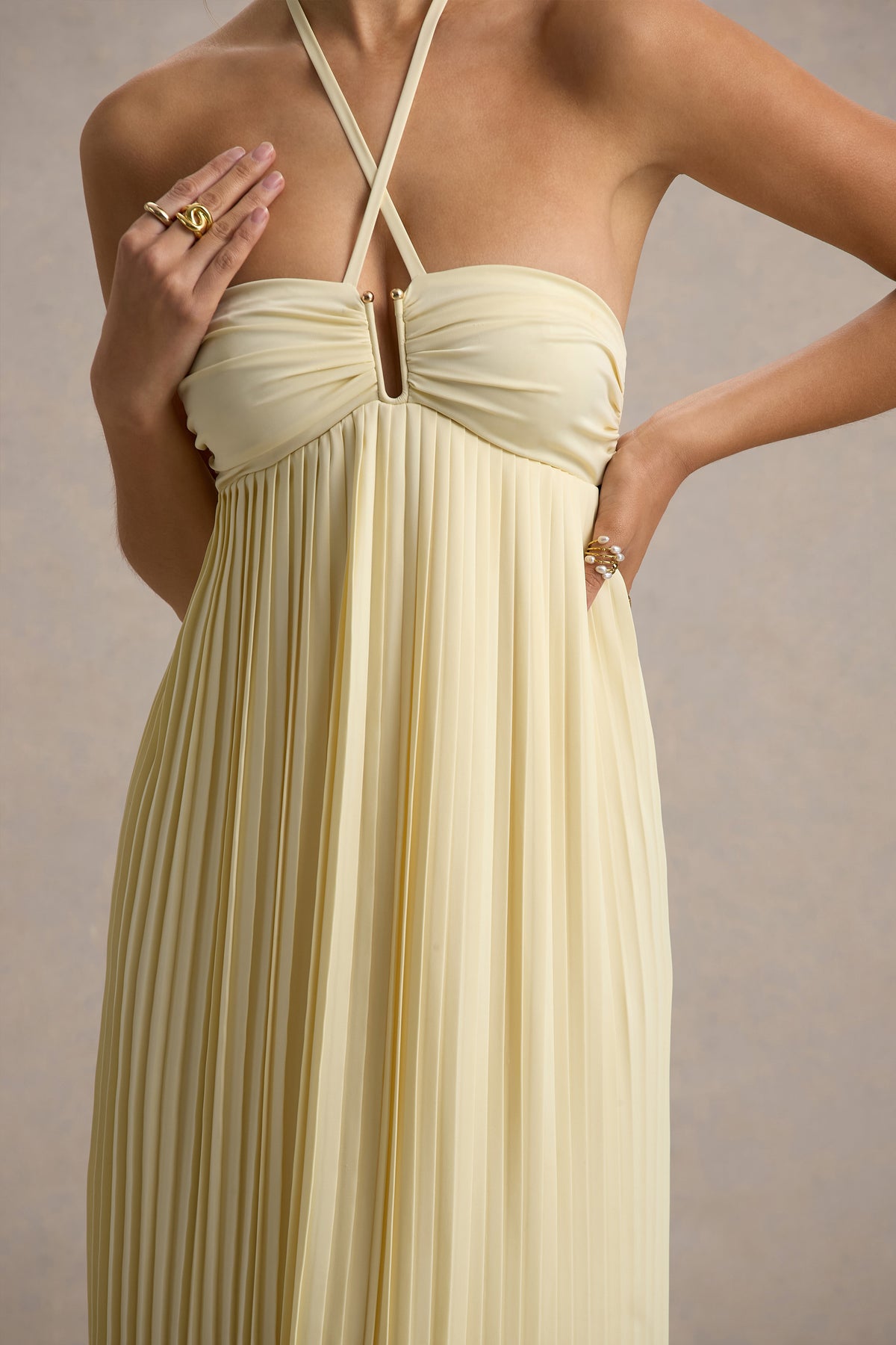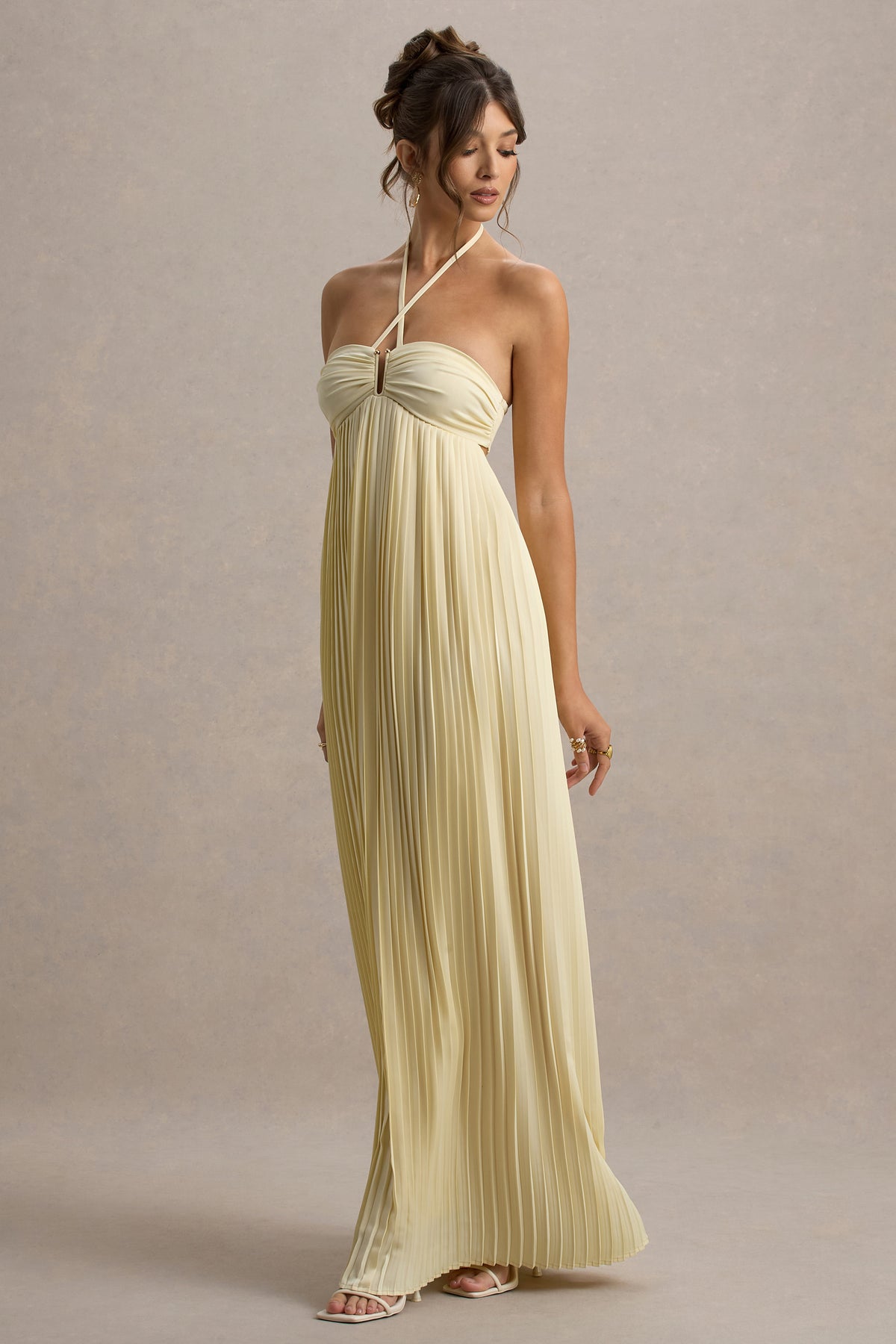Radiate effortless elegance in Elayne the must-have maxi for sun drenched celebrations and unforgettable evenings. Designed in our premium stretch satin in a pale lemon hue, this dress cascades beautifully with a flowing pleated skirt, creating graceful movement with every step. The striking gold U-shaped detail at the chest adds a luxe touch, while the functional halter neck tie allows for a flawless, adjustable fit. This maxi will be your go-to for summer events and rooftop cocktails this season.