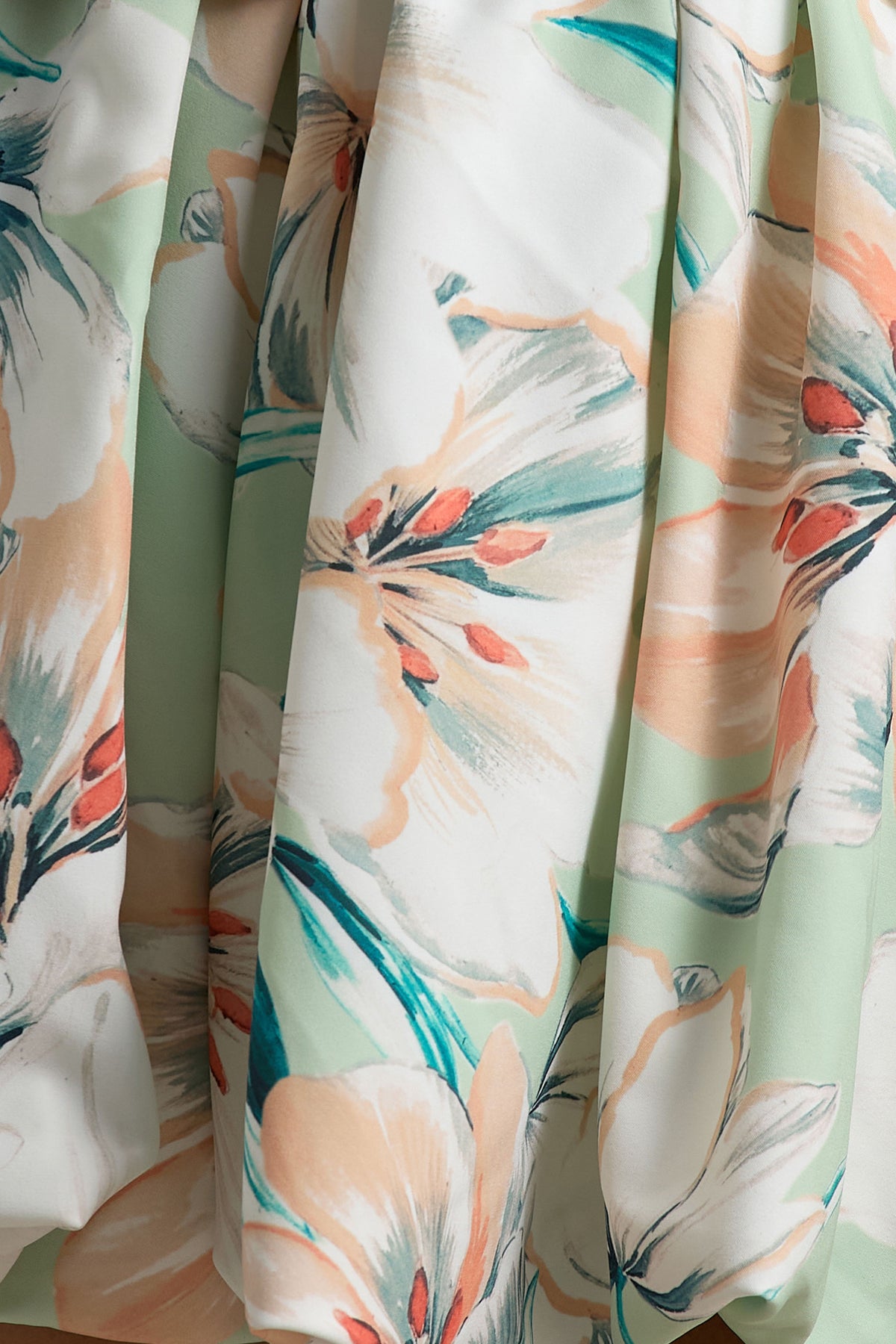For a chic look that can be styled day-to-night, Georgie is the piece for you. This mini is cut in a soft peach floral print of our premium crepe, featuring a sweetheart neckline that elegantly highlights your decolletage and a puffball skirt to add a playful touch. Finished with delicate ruched detailing this mini is adorned with detail that'll turn heads. From ladies brunches to elegant evening soirees, Georgie will see you through the whole season.