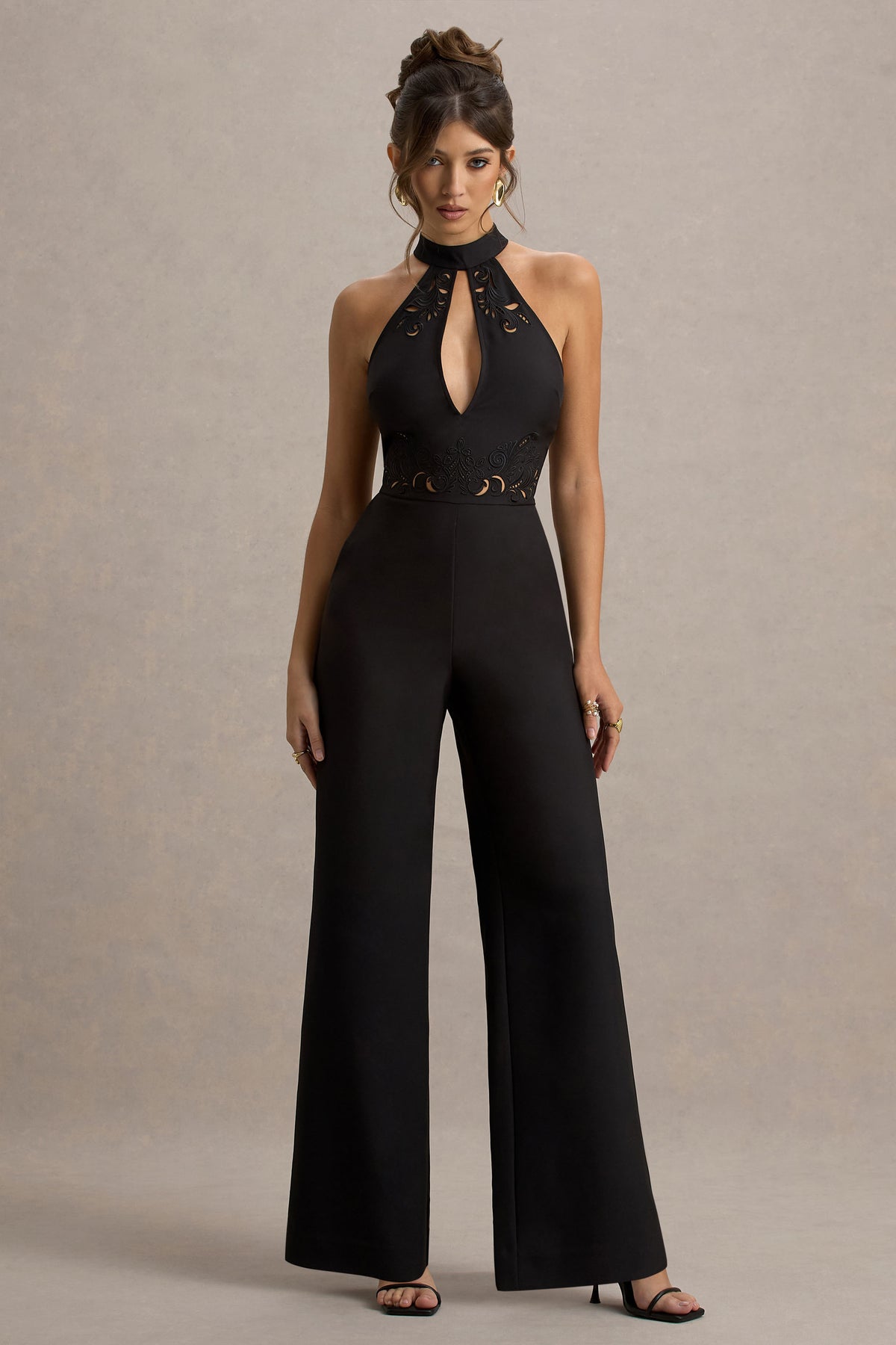 For a look that is sleek and elegant, Kami is the jumpsuit for you. Designed in a deep black hue of our premium stretch crepe, this jumpsuit offers the ultimate figure flattering finish that'll have you feeling your best all night long. The halter neckline is elevated with a chest cut-out detail, adding a modern edge that beautifully contrasts the delicate embroidered bodice. This is the perfect piece for any evening affair styled with gold accessories and sleek heels.