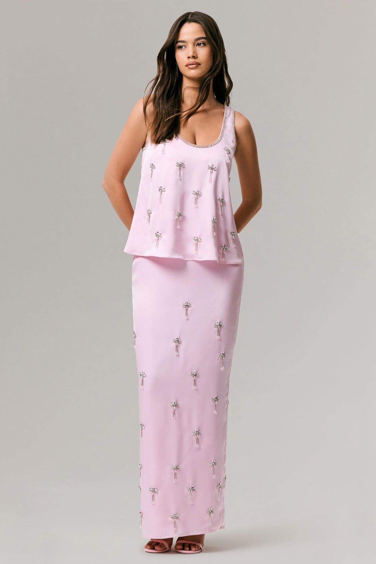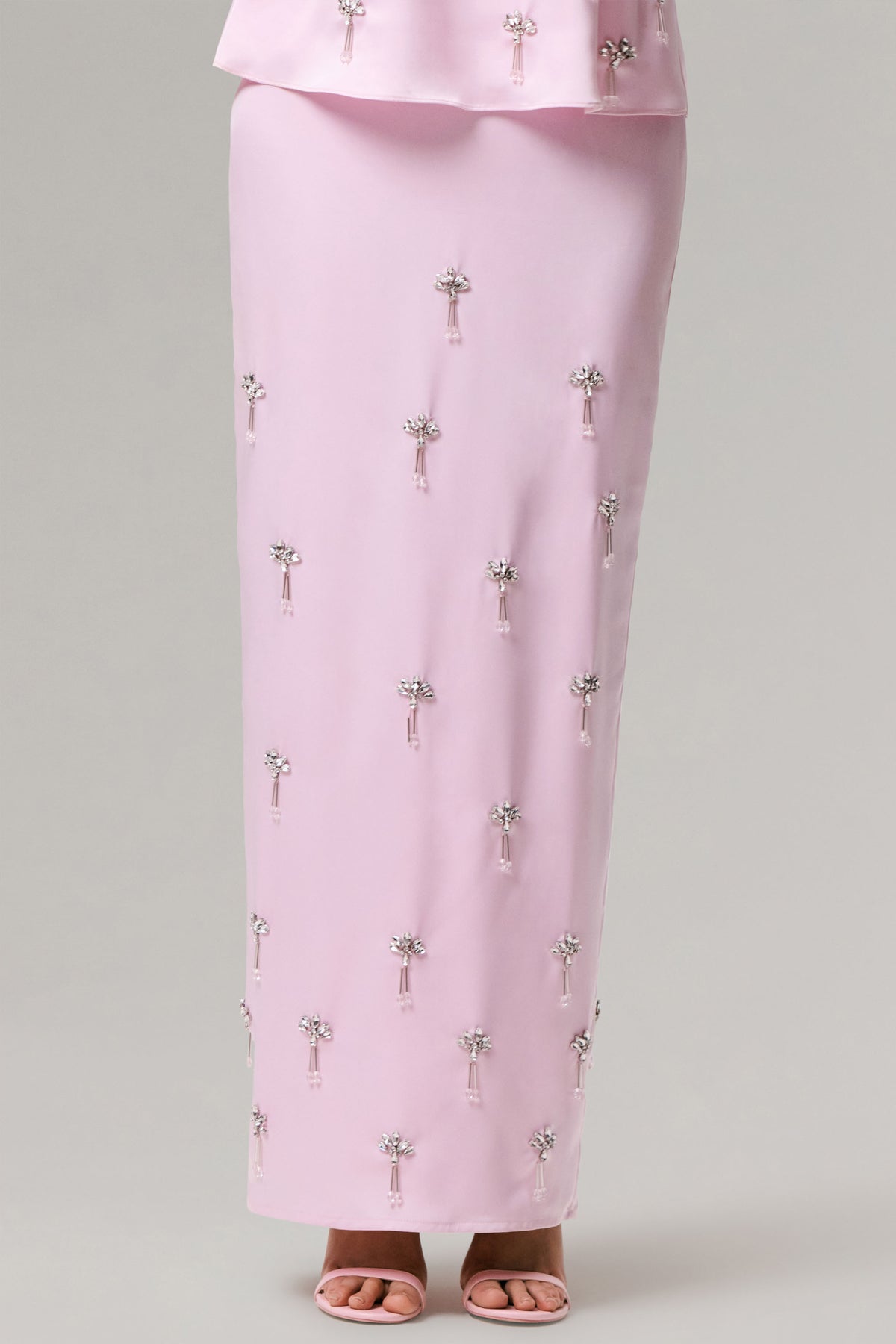 Steal the spotlight at your next dressed up occasion in Lena. Designed from our premium stretch satin in a soft shade of pink, this maxi skirt effortlessly skims over your curves, creating a dreamy silhouette. Finished with a chic, embellished waistline, for a touch of modern femininity, that cascades down into a delicately hand embellished skirt that moves effortlessly with you. Style with our Arianna top for a look of utter elegance.