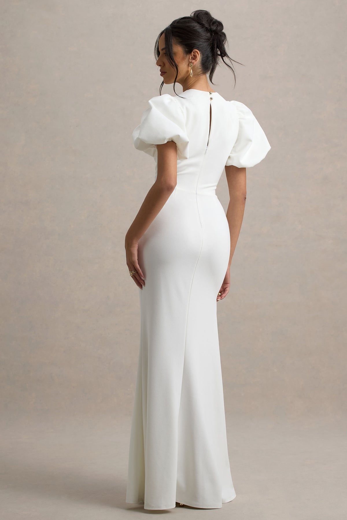 Exude a romantic state of mind in our aptly-named maxi, Love Letters. Crafted in a pretty white shade of our premium scuba crepe, this floor-sweeper boasts artful puff sleeves and a high-leg split. Compliment this occasion maxi by styling yours with some glistening gold accents.