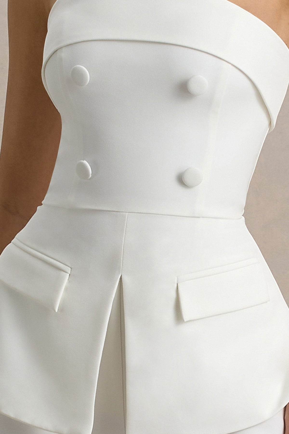 Introducing our latest jumpsuit Noemi, a piece that exudes glamour sophistication. Curated in a classic white shade of our premium stretch crepe, this piece flatters your figure beautifully. Featuring a feminine bandeau neckline, that elegantly frames your shoulders, and detailed with self covered buttons and pocket flaps for an utterly chic finish. From ladies brunches to elegant date nights, Noemi will see you through all occasions.