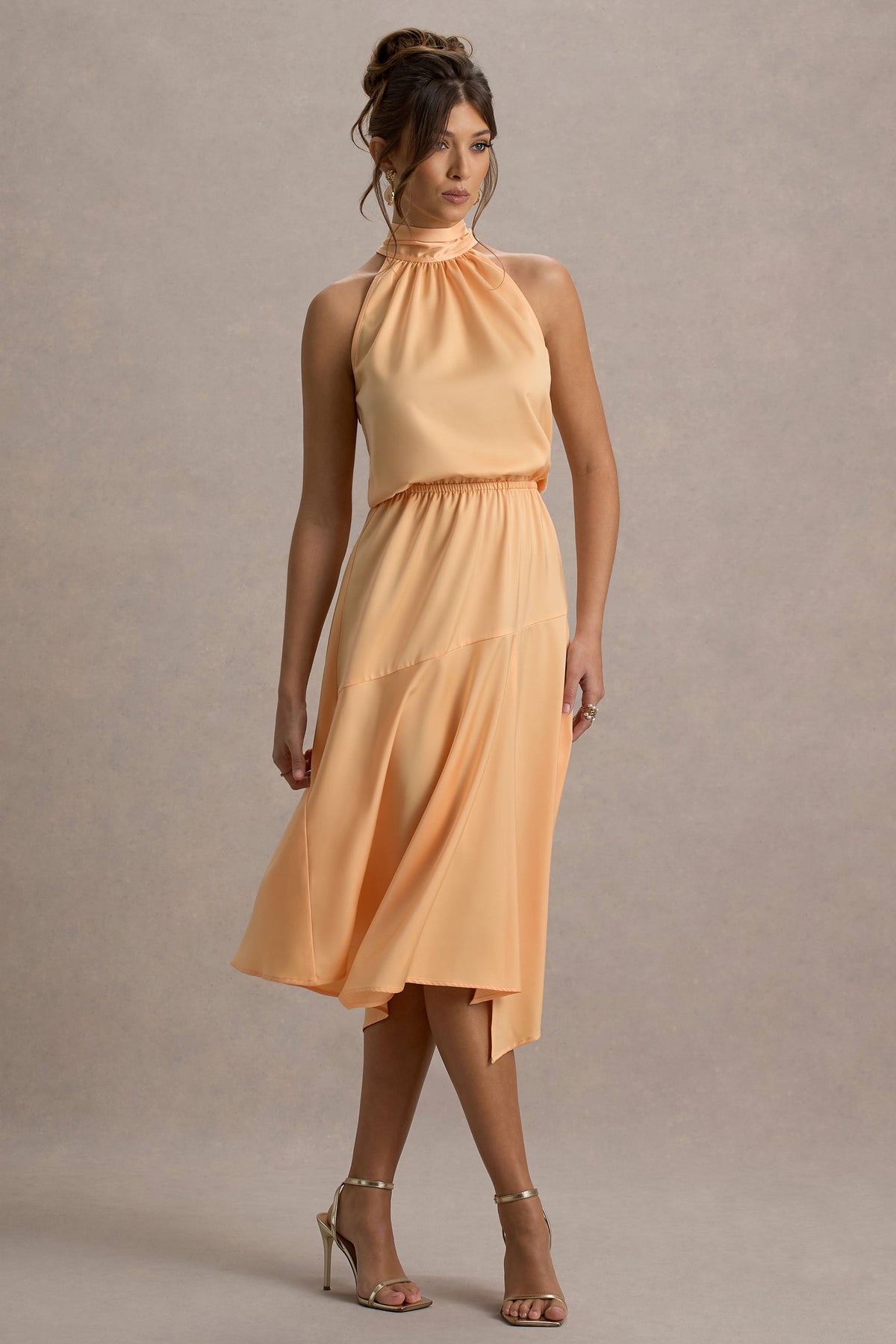Event season calls for a polished piece like Palonia. Crafted from a fluid satin, this peach midi dress offers up elegance through a demure high neckline, self-tie straps and split hemline. For the perfect garden party inspired look, compliment yours with a simple tousled bun and strappy stilettos.