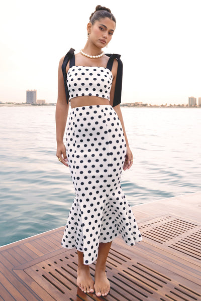 Your new go-to piece for effortless elegance has arrived, Phoebe. Designed in our premium scuba foam and finished in a timeless black and white polka dot. This structured crop top features a flattering square neckline and statement tie sleeves for a feminine bow detail at the shoulder. Flirty yet refined, Phoebe pairs perfectly with our Amadea skirt, for a look that's unapologetically chic.