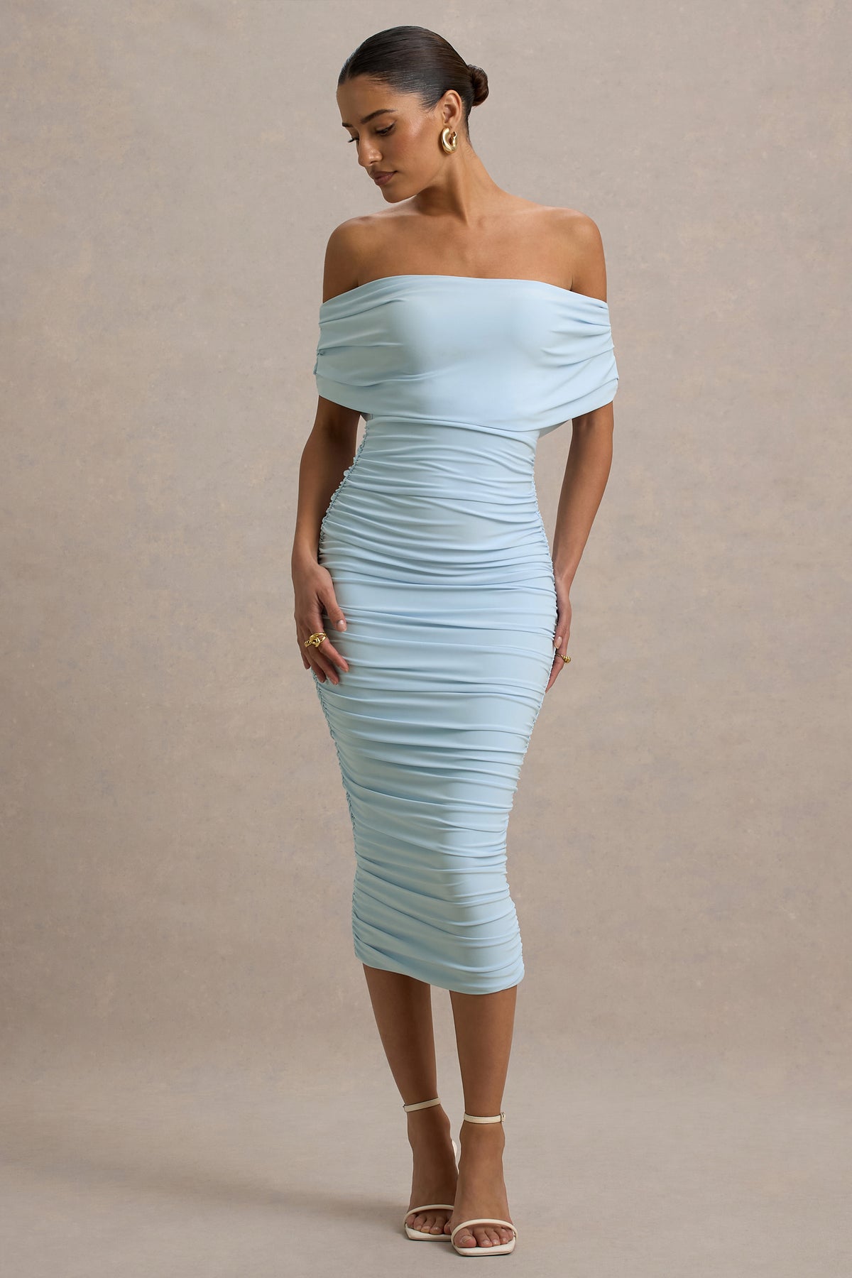 When the occasion calls for the perfect midi dress, then Rayleigh is the standout answer. With trending ruched details and a beautiful bardot neckline, the powder blue premium stretch jersey comes to life, making every head turn in your direction.