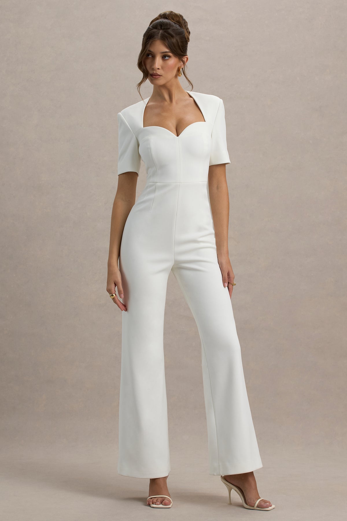 Defined by sophisticated details and modern elegance, Simone is a standout piece for your next special occasion. Crafted from our premium crepe, this white jumpsuit features a flattering sweetheart neckline and chic short sleeves that exude timeless allure. The wide-leg silhouette creates a dramatic flow, designed to elongate your frame while adding effortless glamour. Perfect for evening events or cocktail parties.
