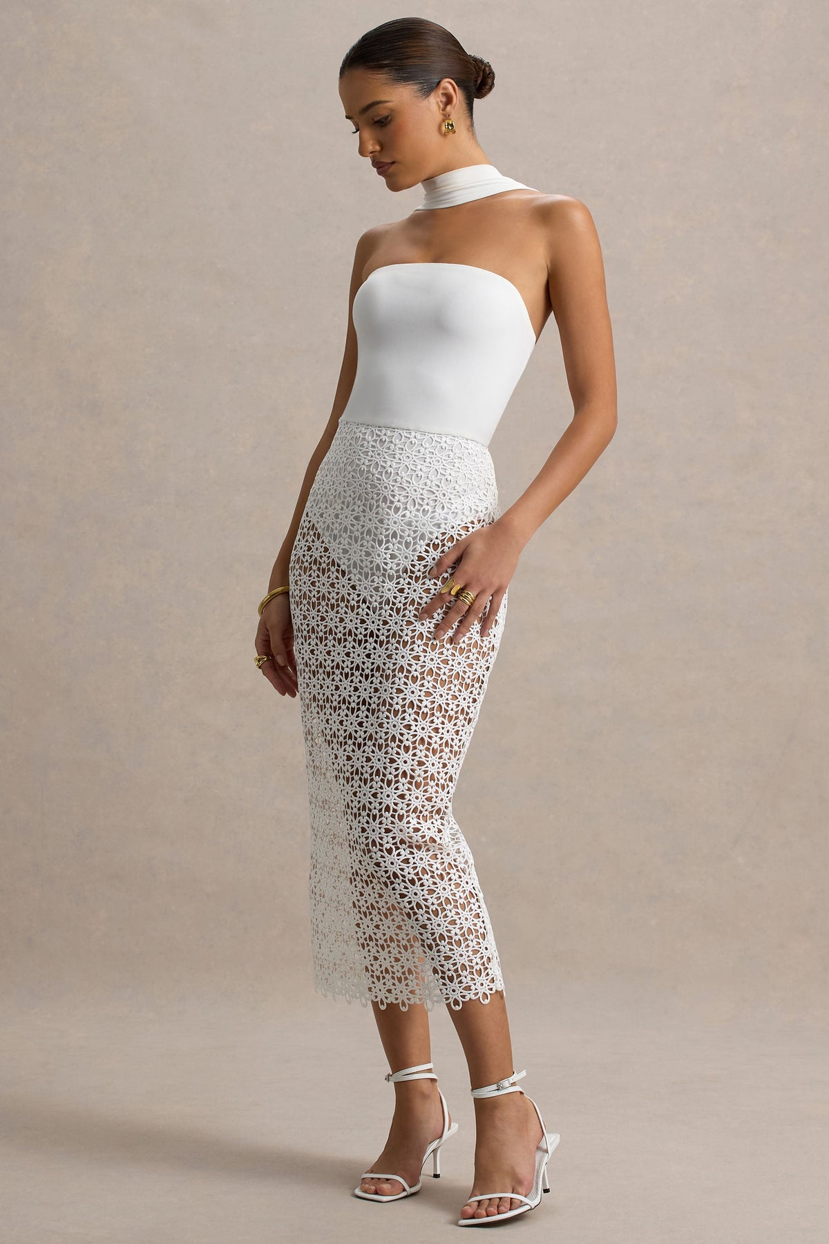 From girls nights, to date nights in our Tamala midi you will capture the rooms attention. Curated from our premium lace in a classic white shade, this piece is both romantic and sultry. The folded bandeau neckline detail, paired with the exposed decolletage brings a modern edge that is complimented beautifully by the intricate, delicate lace skirt. Pair Tamala with sleek heels and gold accessories for a look that'll turn heads.