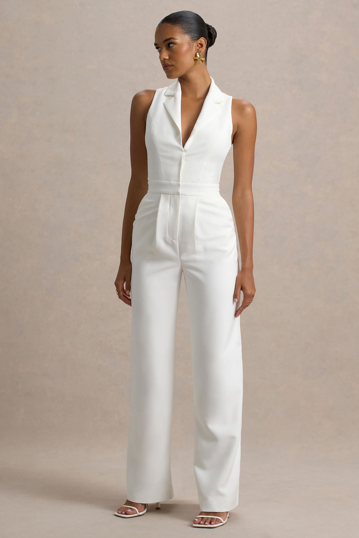 Command the room in Trixie, a sleek jumpsuit designed to flatter and empower. Curated in a classic white shade of our premium stretch crepe, for a sculpted fit. This sleeveless silhouette is framed by a tailored collar and boasts a plunge neckline, bringing a sophisticated edge to this piece. Finished with a high waist to enhance your curves and figure, in Trixie you will exude confidence. Style with a sleek heel for cocktail evenings all season long.