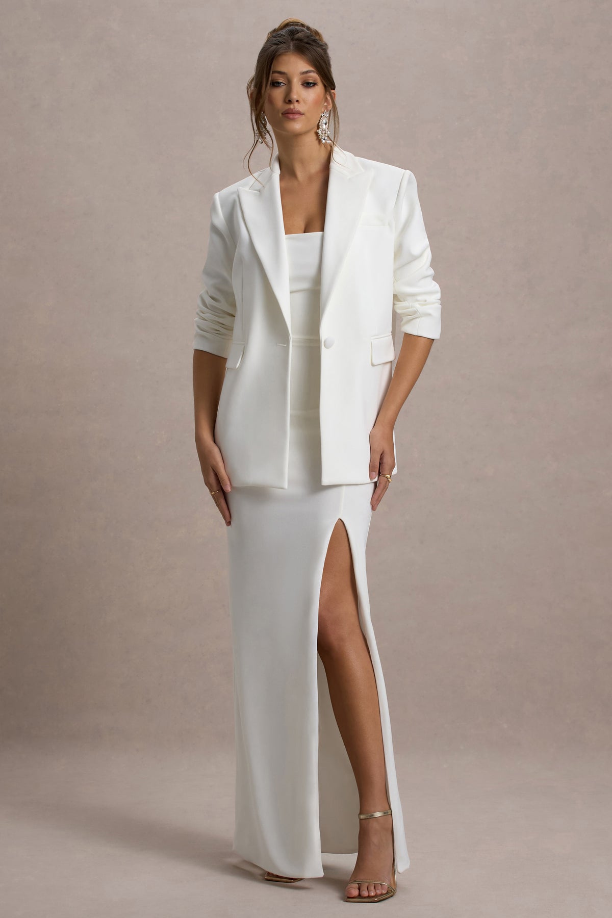 Embody effortless chic this party season with Urban. Designed in a crisp white shade of our premium crepe, this boxy blazer consists of subtle shoulder padding, peak lapels and a self-covered button closure. For an elevated cocktails attire, style yours with some court shoes like Blade.